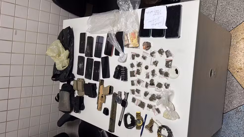 Com o grupo, os policiais apreenderam duas pistolas, um revólver, duas granadas, 12 celulares, seis relógios, maconha, cocaína e dinheiro.